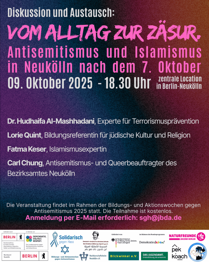 Diskussion und Austausch: „Vom Alltag zur Zäsur. Antisemitismus und Islamismus in Neukölln nach dem 7. Oktober“ am 09. Oktober 2025 in Berlin-Neukölln